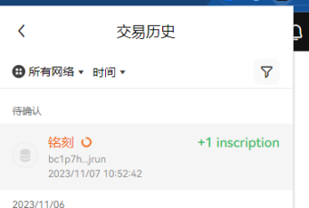 5.打成功后你就可以在钱包里里面看到。然后在钱包里下滑,找到币种管理,输入你刚刚铸造的币种名称。点击交易历史,等待铭刻成功就行了。