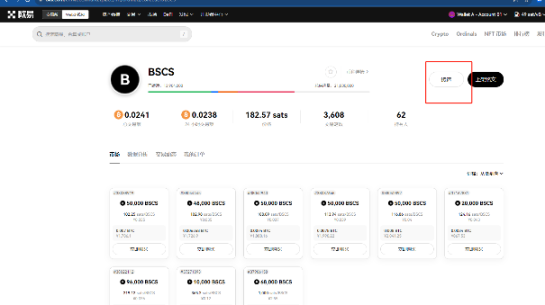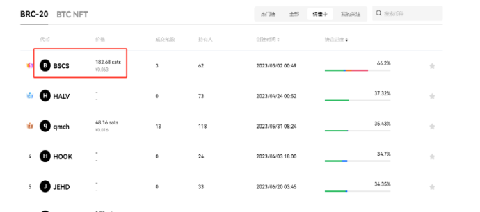 1、接下来,我们就来操作一下。点击铸造中。就可以看到正在铸造的铭文。那我们可以选择铸造进度靠前的来进行铸造。那比如这个排名第一的“BSCS”。点击“BSCS”,点击右上角铸造。