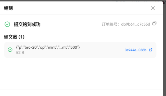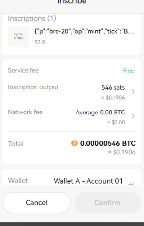 3.我们就可以在钱包里面看到我们打 1 次所有的话费。大约是 0.4u 左右.确定之后,就等待铭文打成功。