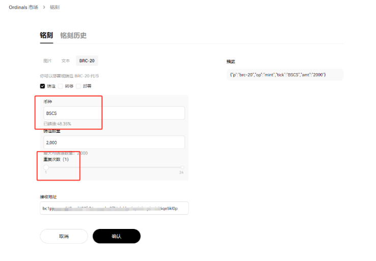 2.选择好了之后,就选择相应的数量。再打的时候,我们要注意选择已经部署好了的代币。这样才可以去进行交易。那么重复次数,就是你一次可以打多少数量。重复 1 次就是打 1 张。选择好之后,就点击确认
