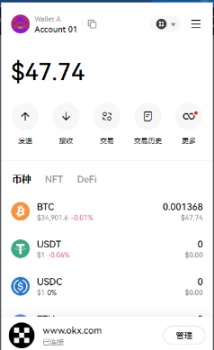2.连接之后。点击谷歌浏览器右上角,找到我们的 ok 钱包。选择 btc,那么出来的第一个地址,上面是 taproot 的地址。去点击接收、复制地址。把我们其他钱包或者交易所里面的 btc 转到我们新钱包里面的,来作为铸造铭文的 gas 费。