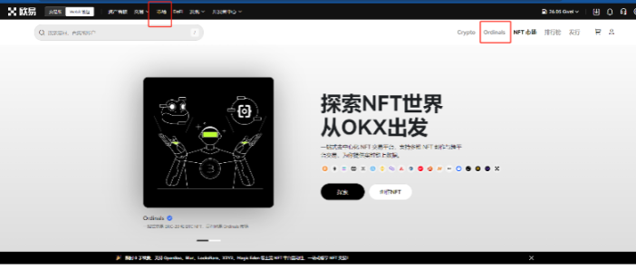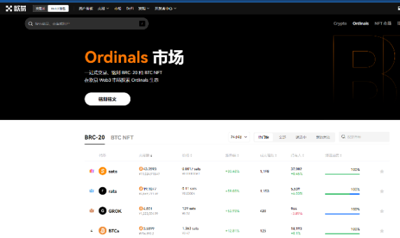 3.再等待 btc 转入的过程中,我们点击左上角的市场。点击 ordinals。就可以看到 brc20 和 btc nft。那么我们可以看到有 100% 的,就是已经打完了,可以交易的铭文。也可以看到有的也是涨的很厉害。